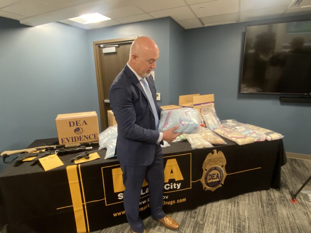 Pullen spoke to reporters at the DEA’s office in Salt Lake City on Thursday, standing in front of a table piled with around 240,000 fentanyl pills, bags of heroin and methamphetamine, and a rifle, shotgun and handgun — all the result of recent seizures.