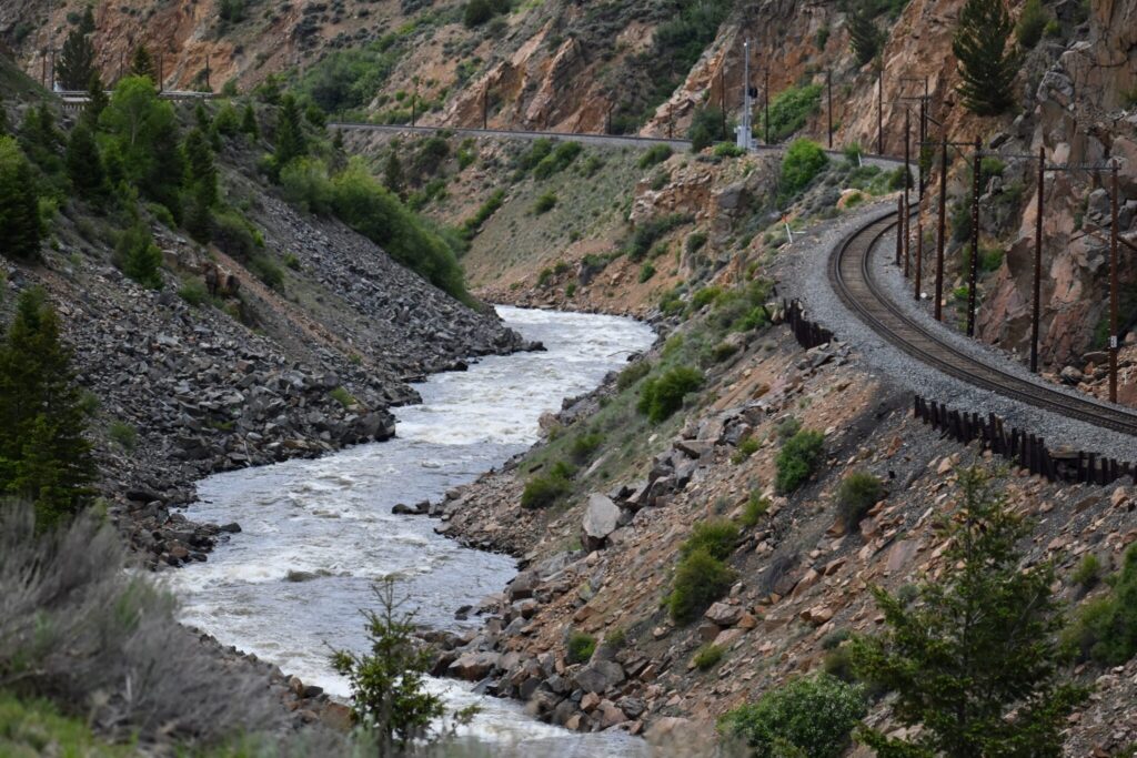 Train tracks along the Colorado River through Byers Canyon southwest of Hot Sulphur Springs are pictured on June 11, 2023. (Chase Woodruff/Colorado Newsline)