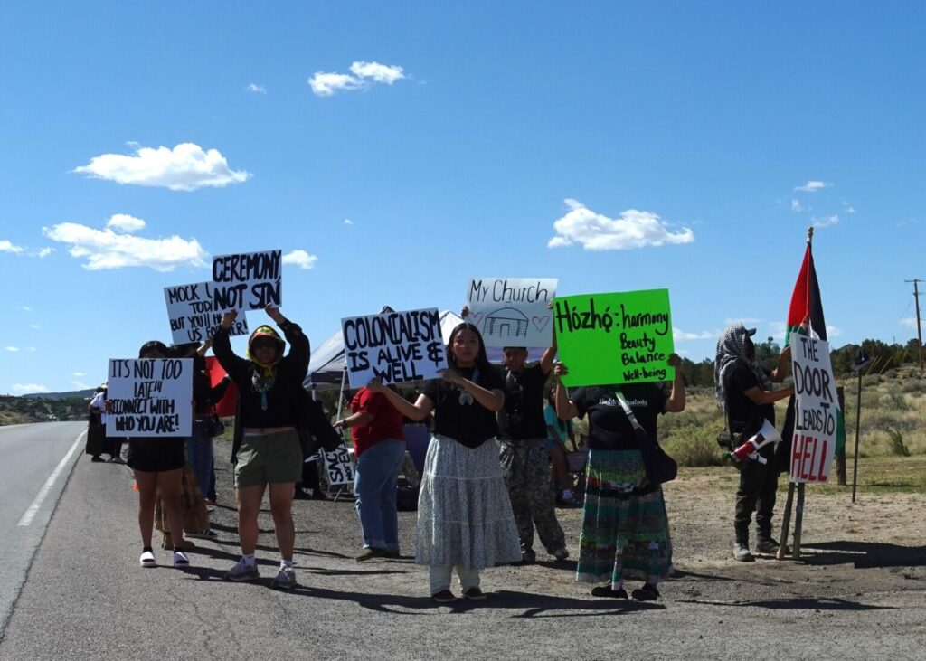 Navajo woman Louvannina Tsosie (center) holds the sign “Colonialism is Alive & Well” during a peaceful protest across the street from The Door Christian Fellowship Church on June 8, 2025. The protest was in response to the church staging a play that mocked and demonized Navajo ways of life. (Photo courtesy Sherdan Kady)