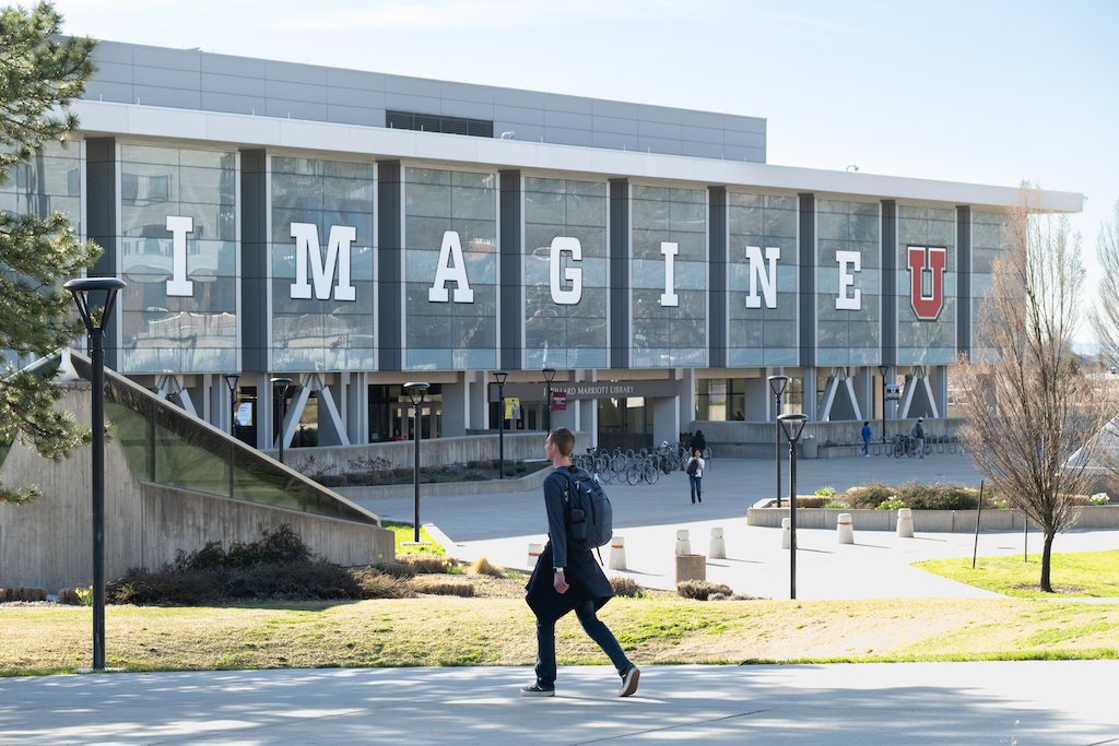 A student walks on the University of Utah campus in Salt Lake City in April. Utah has enacted a new law that prohibits schools from using diversity, equity and inclusion statements, bars state institutions from relying on specific individual characteristics in employment and education decisions, and eliminates central offices dedicated to DEI. (Erika Bolstad/Stateline)