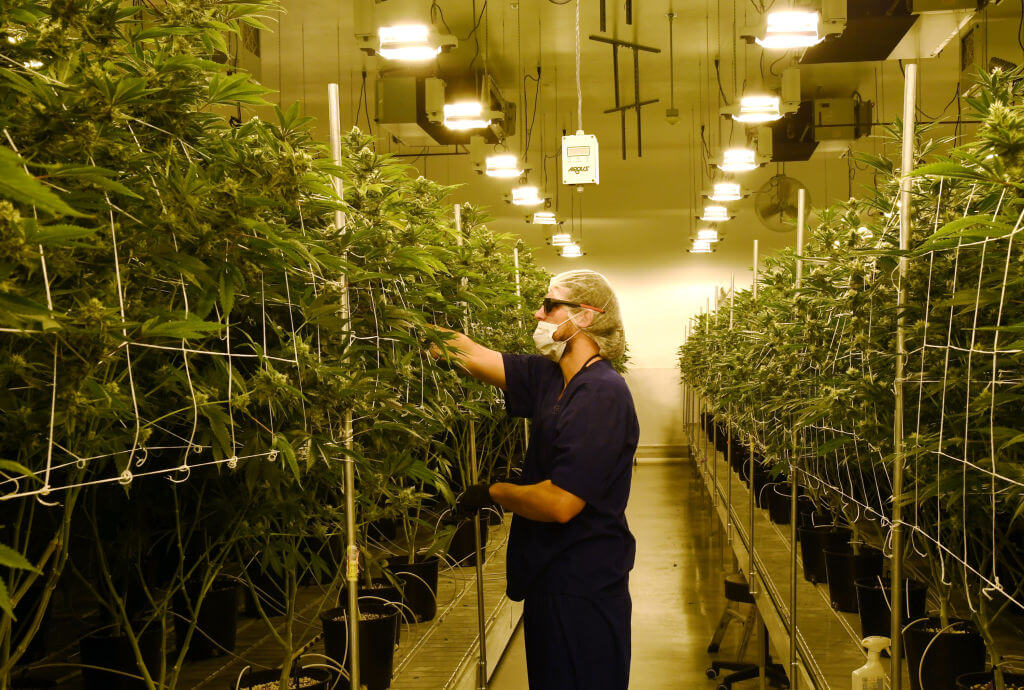 David Burr demonstrates removing leaves on marijuana plants to allow more light for growth at Essence Vegas’ 54,000-square-foot marijuana cultivation facility on July 6, 2017 in Las Vegas, Nevada. (Photo by Ethan Miller/Getty Images)