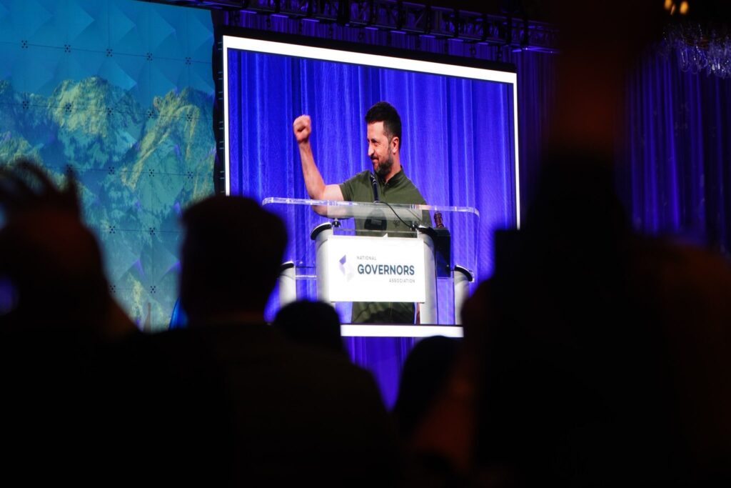 Zelenskyy’s speech in Utah was in front of about a dozen governors from across the country sitting at a table in front of a room full of hundreds of other attendees. His message focused on continuing support for Ukraine — not for “boots on the ground” to fight, but continued military aid in air defense and weapons as well as “support in protecting normal life and rebuilding.”