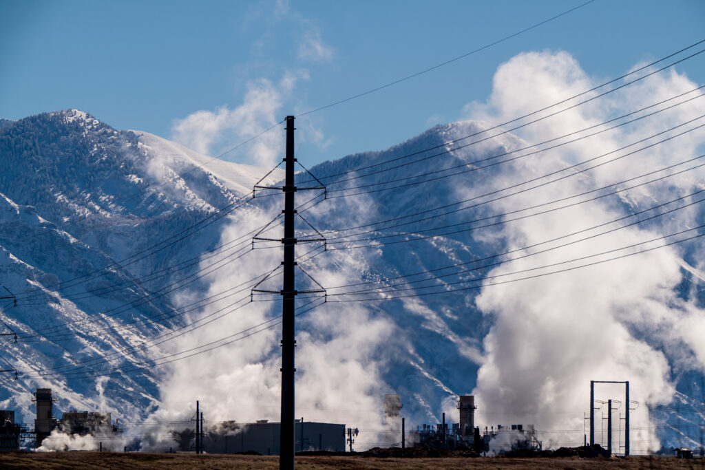 Power transmission lines are pictured in front of the Lake Side natural gas power plant in Vineyard on Sunday, Feb. 4, 2024. (Photo by Spenser Heaps for Utah News Dispatch)
