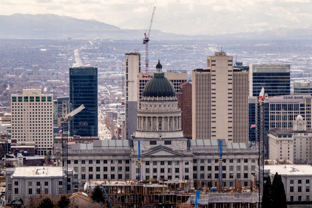 The Utah Capitol is pictured with downtown Salt Lake City behind it on Friday, Jan. 26, 2024. (Photo by Spenser Heaps for Utah News Dispatch)