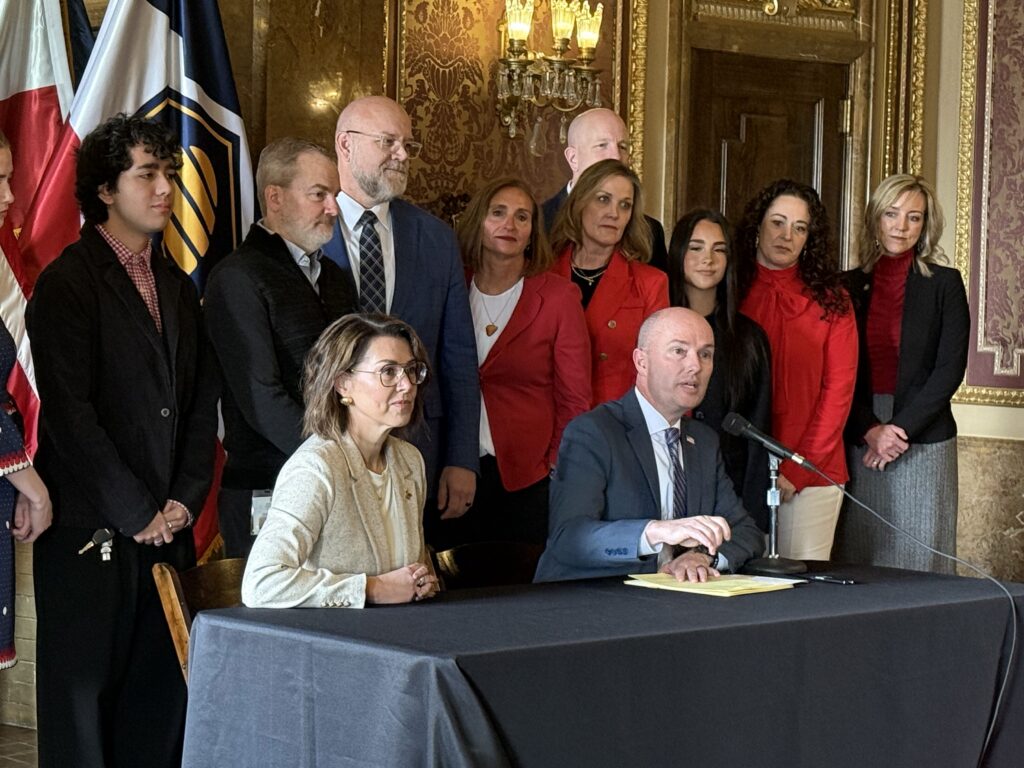 Gov. Spencer Cox and Lt. Gov. Deidre Henderson at a ceremonial signing event on tech safety bills at the Utah State Capitol on April 4, 2025 (Alixel Cabrera/Utah News Dispatch)