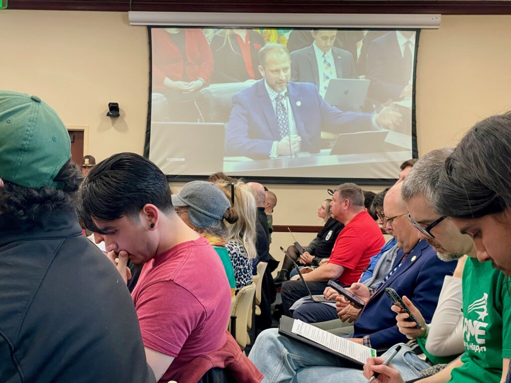 Members of the public listen to Rep. Jordan Teuscher, R-South Jordan, explain a bill that would prohibit public unions from collective bargaining at the Utah Capitol Building on Wednesday, Jan. 29, 2025. (Katie McKellar/Utah News Dispatch)