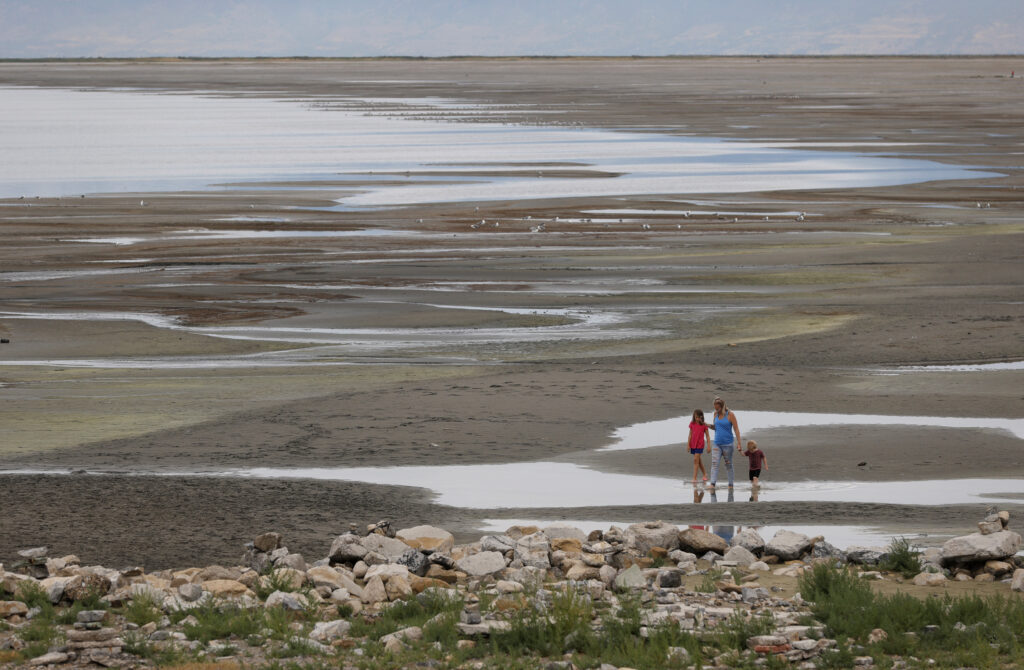 Park visitors walk along a section of the Great Salt Lake that used to be underwater at the Great Salt Lake State Park on August 02, 2021, near Magna, Utah. (Photo by Justin Sullivan/Getty Images)
