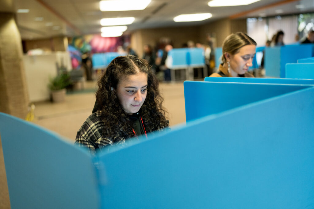 Nadia Ammar, 28, casts her ballot at the Salt Lake County Government Center on Tuesday, Nov. 5, 2024. (Photo by Spenser Heaps for Utah News Dispatch)