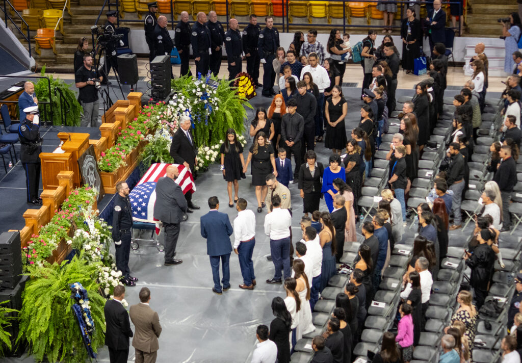 Cluff, who met Estrada when she was in the police academy in 2019, was one of the opening speakers during the funeral service at the Utah State University’s Dee Glen Smith Spectrum. She remembered her colleague as someone most comfortable on patrol, approaching people in his community with a friendly demeanor that would ease even the worst moods.