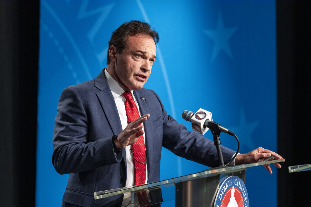 Frank Mylar answers questions during a media scrum after the attorney general GOP primary debate with Derek Brown and Rachel Terry at the KUED Studio, on Tuesday, June 11, 2024. (Pool photo by Rick Egan/The Salt Lake Tribune)