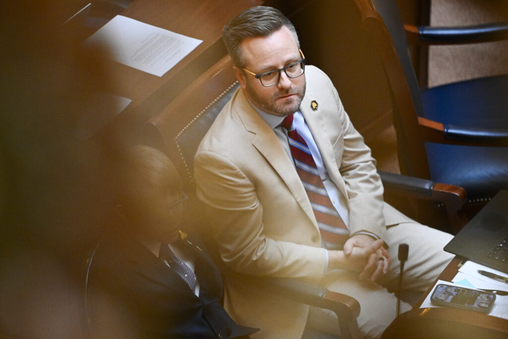 Sen. Brady Brammer, R-Pleasant Grove, looks on at the Utah State Capitol on the last day of the legislative session, Friday, March 7, 2025. (Photo by Alex Goodlett for Utah News Dispatch)