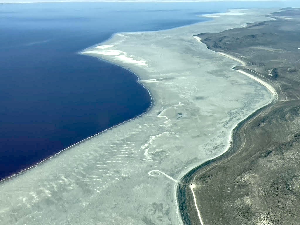 The shore of Great Salt Lake (left) is pictured alongside its historic shoreline (right). The Spiral Jetty lies between them on the dry and dusty lakebed. (Photo courtesy of Bryn Watkins)