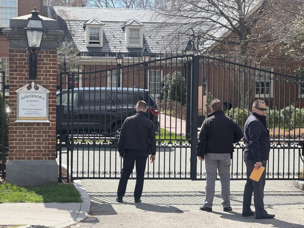 Law enforcement officers stand outside the governor’s residence on April13, 2025, after a fire led to the evacuation of Gov. Shapiro and his family. It is being investigated as arson. (Ian Karbal/Pennsylvania Capital-Star)