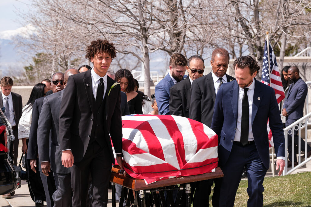 Former Utah Rep. Mia Love’s family members carry her casket outside the Institute of Religion at the University of Utah campus on Monday, April 7, 2025. (Photo by Marco Lozzi for Utah News Dispatch)
