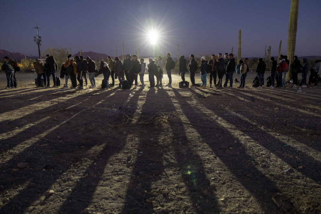 Immigrants line up at a remote U.S. Border Patrol processing center after crossing the U.S.-Mexico border on Dec. 7, 2023, in Lukeville, Arizona. (Photo by John Moore/Getty Images)
