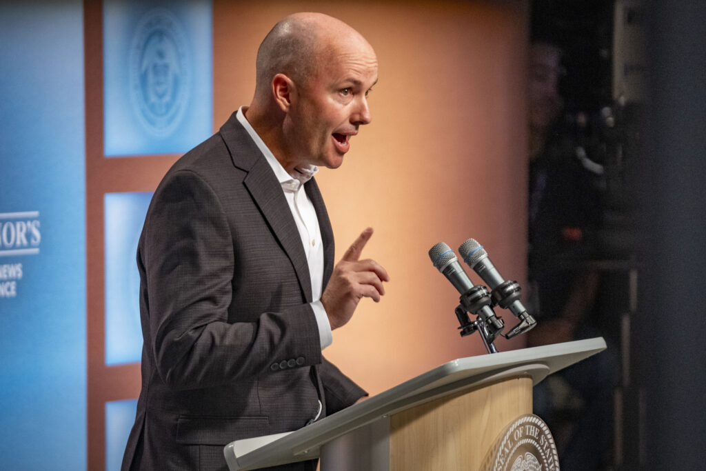Gov. Spencer Cox speaks with members of the media during the governor’s news conference broadcast by PBS Utah at the Eccles Broadcast Center in Salt Lake City on Thursday, August 21, 2025. (Pool photo by Rick Egan/The Salt Lake Tribune)