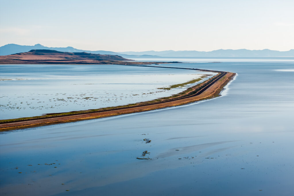 The Davis County Causeway cuts through the Great Salt Lake toward Antelope Island on Tuesday, May 21, 2024. (Photo by Spenser Heaps for Utah News Dispatch)