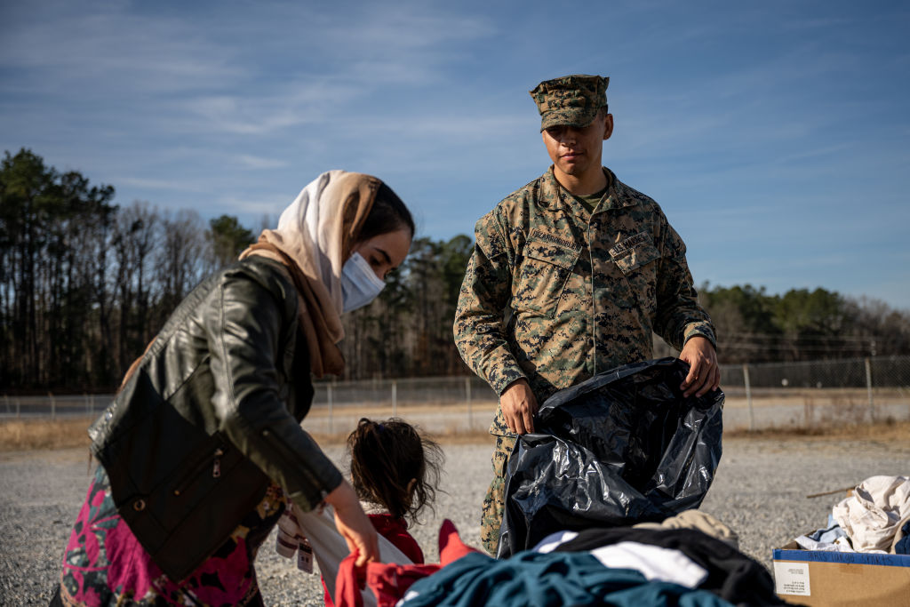 An Afghan woman and her child browse through donated clothing at Fort Pickett in December 2021 in Blackstone, Va. Afghans brought to the United States after the war, many having helped U.S. armed forces, are now among the immigrants with legal status facing a possible loss of public benefits under the Senate tax and spending package passed Tuesday. (Photo by Jon Cherry/Getty Images)