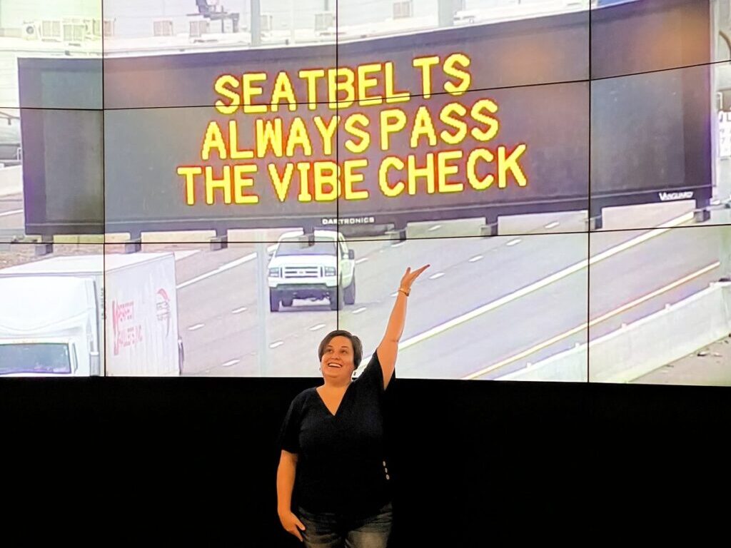 Another contest winner, Elise Riker, won for “SEATBELTS ALWAYS PASS THE VIBE CHECK” which was also displayed last fall. A marketing professor at Arizona State University, Riker told Stateline she crafted it to appeal to Gen Z drivers.