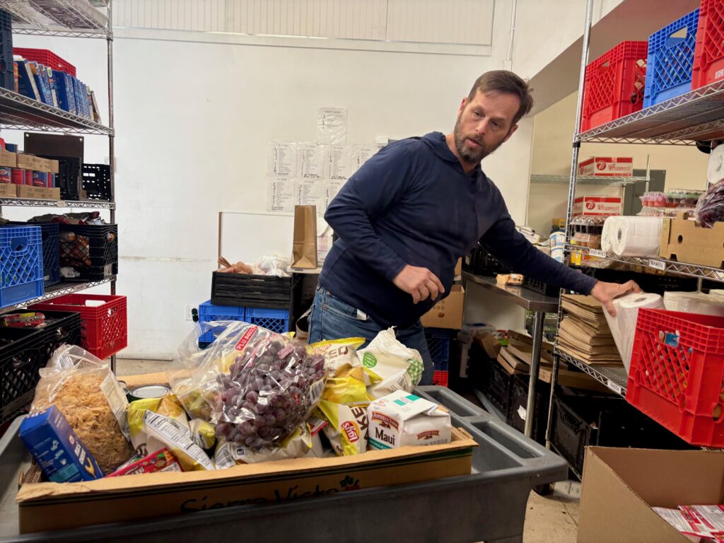 Bill Tibbitts of the Crossroads Urban Center helps prepare a box of food for a family at the center’s west side pantry in Salt Lake City on Oct. 22, 2025. (Annie Knox/Utah News Dispatch)