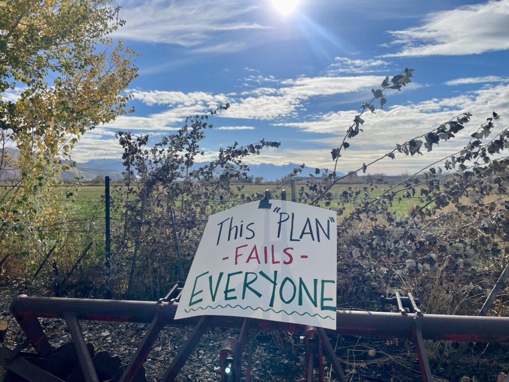A protest sign is pictured on the edges of a 15-acre property that state leaders have picked to build a 1,300-bed homeless “campus” in the Northpointe area of Salt Lake City, pictured on Nov. 18, 2025. (Katie McKellar/Utah News Dispatch)