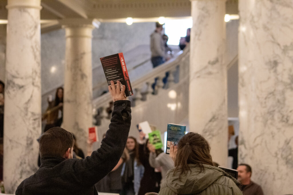 Attendees hold books in support of Idaho libraries at the “Idaho Freedom to Read-in” event held at the Idaho Capitol Building on Jan. 13, 2024. The event was organized by the Idaho Library Association, alongside the Meridian Library Alliance, the North Central Idaho Alliance, the Community Library Network Alliance, and Rediscovered Books. (Mia Maldonado/Idaho Capital Sun)