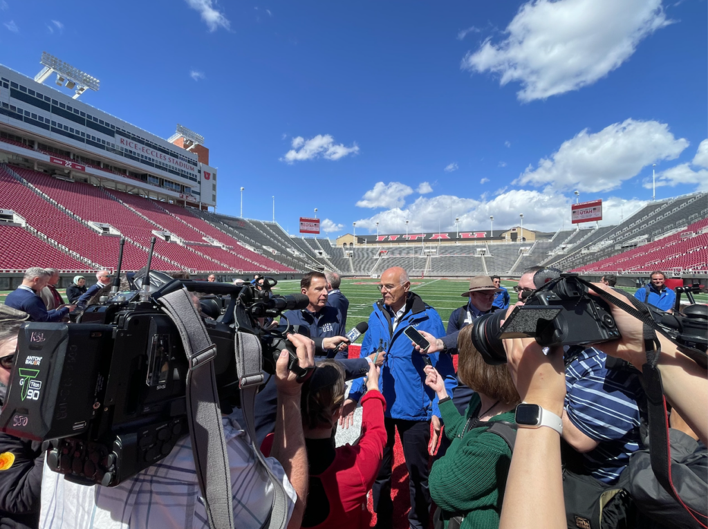 Karl Stoss, chairman of the Future Host Commission and a member of the International Olympic Committee, speaks with reporters after the Future Host Commission toured the Rice-Eccles Stadium on April 10, 2024. The tour was part of a four-day visit to venues that would be used during a 2034 Winter Games hosted by Salt Lake City and Utah. (Katie McKellar/Utah News Dispatch)