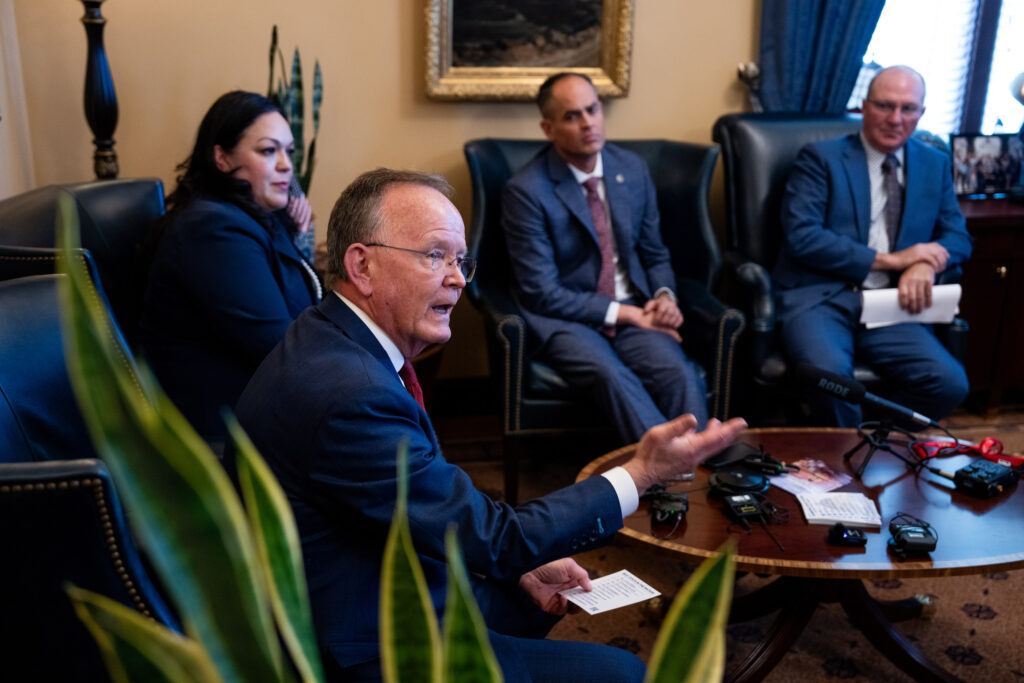 Senate President Stuart Adams, R-Layton, speaks to reporters at the Capitol in Salt Lake City on the first day of the legislative session, Tuesday, Jan. 21, 2025. (Photo by Spenser Heaps for Utah News Dispatch)