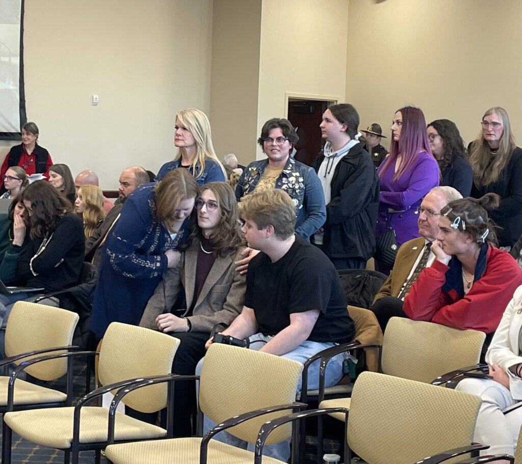 At the presenters’ table, Robertson was seated next to her former suitemate, Avery Saltzman, who testified in favor of the bill. Saltzman’s mother complained to the university about her daughter’s living situation, which included living with a transgender roommate, in a viral Facebook post.