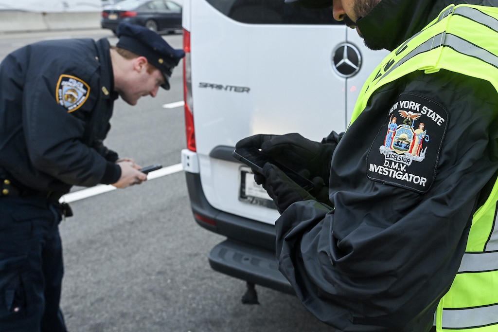 Law enforcement personnel in New York examine a license plate during a multi-agency operation at the Robert F. Kennedy Bridge in March 2024. The operation marked the launch of a new city-state task force aimed at identifying and removing “ghost cars” — vehicles that evade detection by traffic cameras and toll readers due to forged or altered license plates — from New York City streets. (Photo courtesy of Marc A. Hermann/Metropolitan Transportation Authority)