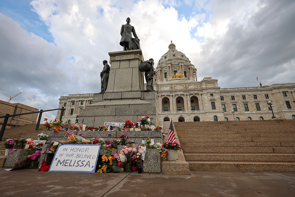ST PAUL, MINNESOTA – JUNE 16: A makeshift memorial for DFL State Rep. Melissa Hortman and her husband Mark Hortman is seen at the Minnesota State Capitol building on June 16, 2025 in St. Paul, Minnesota. Law enforcement agencies captured a suspect in the killing of DFL State Rep. Melissa Hortman and her husband, Mark Hortman, who were shot at their home on June 14th. DFL State Sen. John Hoffman and his wife were also shot and hospitalized in a separate incident. Minnesota Gov. Tim Walz said during a press conference that the shooting “appears to be a politically motivated assassination.” (Photo by Steven Garcia/Getty Images)