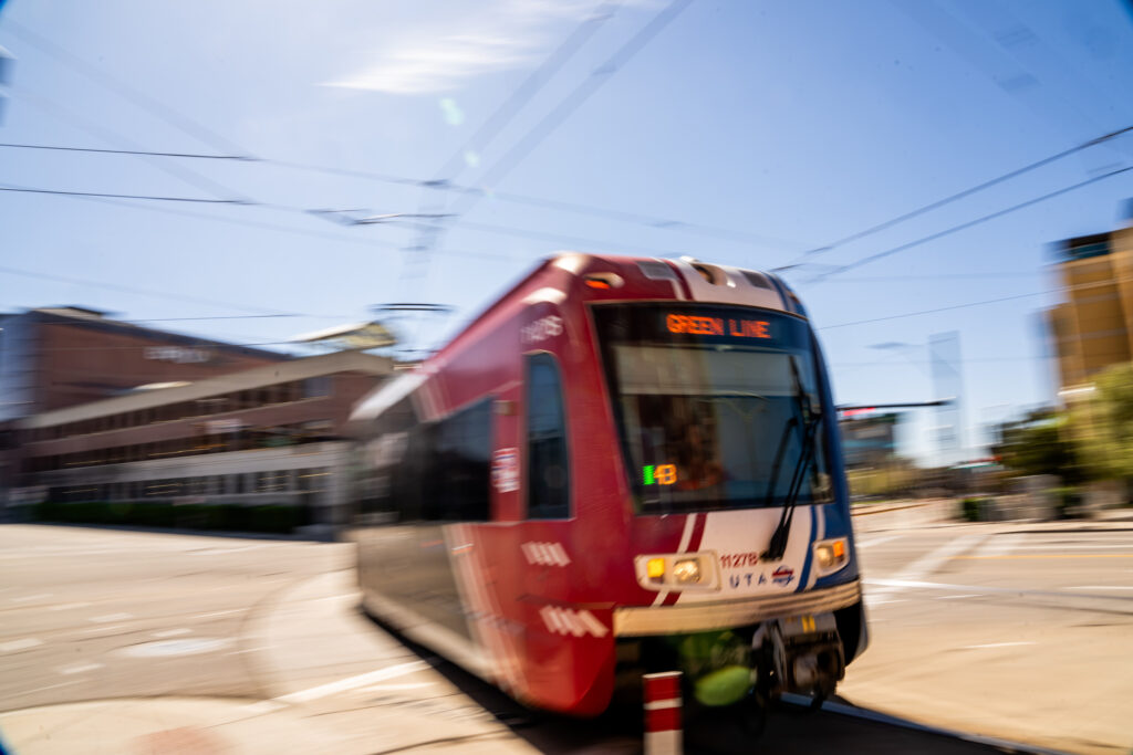 A UTA Trax train travels through Salt Lake City on Thursday, April 18, 2024. (Photo by Spenser Heaps for Utah News Dispatch)