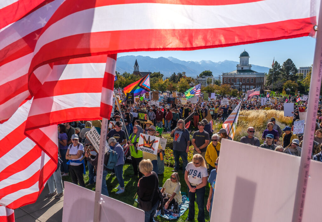 Protesters gather at the Utah Capitol during the No Kings rally in Salt Lake City on Saturday, Oct. 18, 2025. (Photo by Marco Lozzi for Utah News Dispatch)