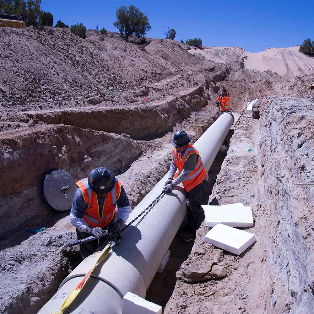 Construction workers in an undated 2020 photo, working on the Navajo-Gallup Water Supply Project. The project aims to pipe clean water to the eastern Navajo Nation, the Jicarilla Apache Nation and the City of Gallup from the San Juan river. (Courtesy of the U.S. Bureau of Reclamation)