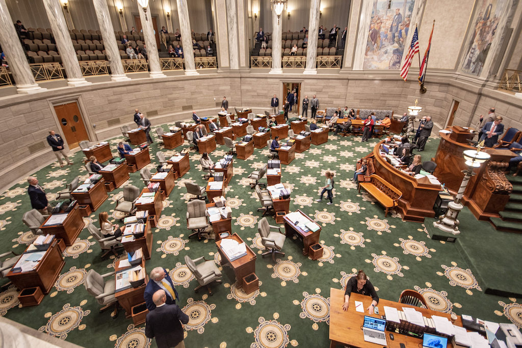 Lawmakers are seen in the Missouri Senate chamber in Jefferson City, Mo. Missouri may become the first state with an income tax to exempt capital gains, but several states have considered tax cut proposals that would benefit the wealthy during this year’s legislative sessions. (Annelise Hanshaw/Missouri Independent)