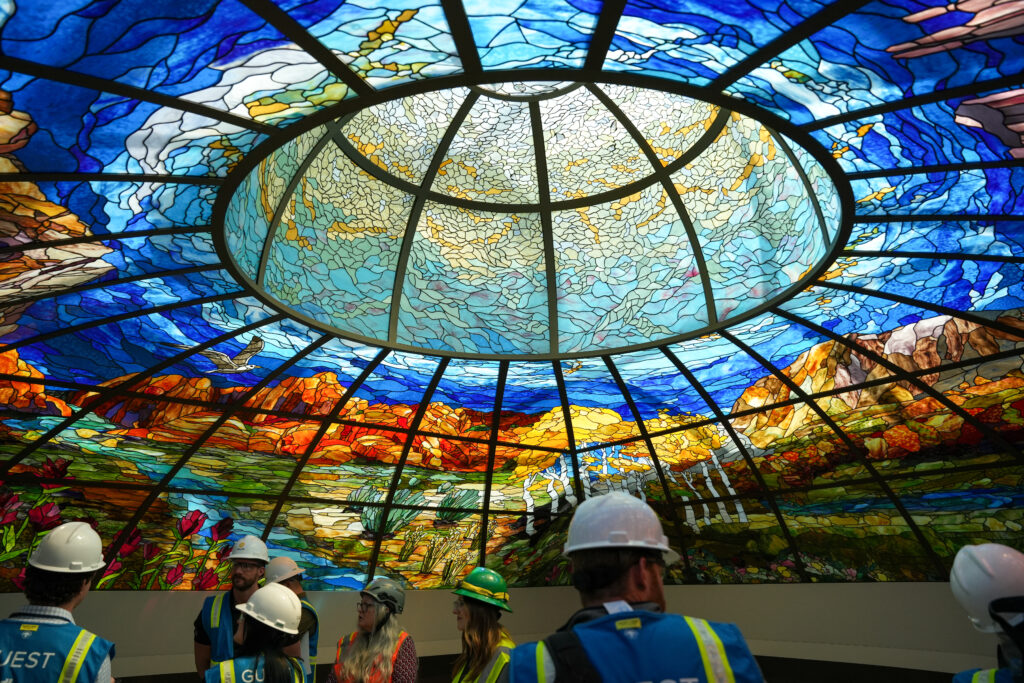 The stained glass mural was designed by lead artist Dallin Orr at the Lehi-based stained glass studio Holdman Studios, selected through a competitive bidding process. Orr told reporters his goal was to capture “harmony” by balancing all of Utah’s “chaotic and diverse biomes,” from the snowy mountain peaks to the deserts — all anchored around the dome’s center point, the sun.