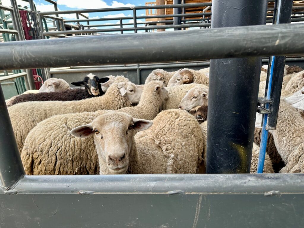 A flock of sheep is gathered in a pen as they wait for a much-needed haircut from a group of Diné volunteers during a shearing event held on July 4, 2025, at the Navajo Nation Fairgrounds to help sheep evacuated from the Oak Ridge Fire. (Photo by Shondiin Silversmith/Arizona Mirror)