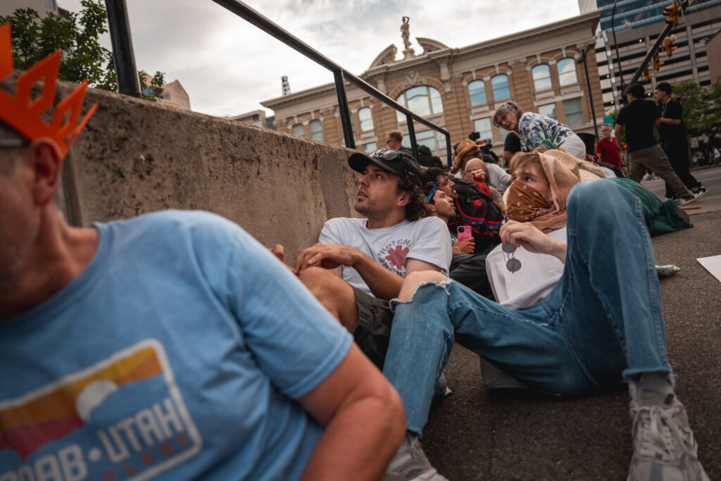 People take cover after gunshots rang out during the “No Kings” protest in Salt Lake City on Saturday, June 14, 2025. (Photo by Spenser Heaps for Utah News Dispatch)