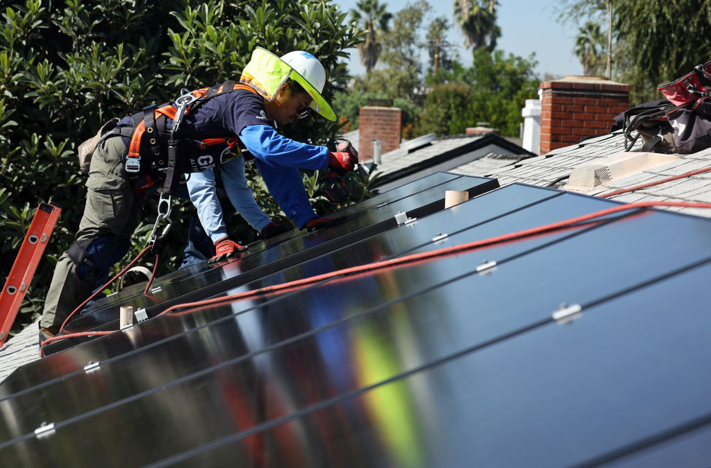 A GRID Alternatives employee installs solar panels on the rooftop of a low-income household in Pomona, Calif. Funding from the federal climate law is providing billions of dollars to support rooftop and community solar in all 50 states. (Mario Tama/Getty Images)