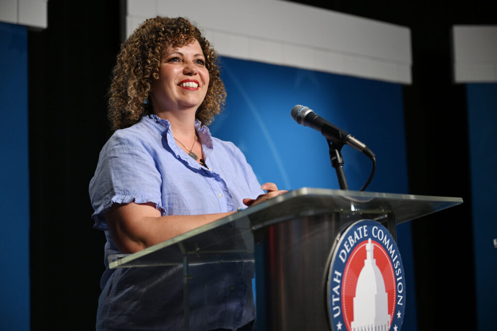 Congresswoman Celeste Maloy takes her opportunity to talk after Utah’s 2nd Congressional district debate between and herself and Colby Jenkins at the KUED studios at the University of Utah in Salt Lake City on Monday, June 10, 2024. (Pool photo by Scott G Winterton/Deseret News)