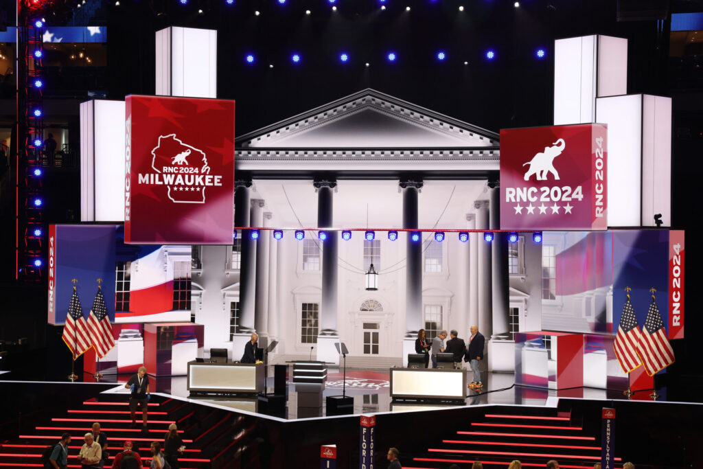 Workers prepare the stage for the Republican National Convention at the Fiserv Forum on July 13, 2024, in Milwaukee, Wisconsin. The convention will be held in Milwaukee from July 15-18. (Photo by Scott Olson/Getty Images)
