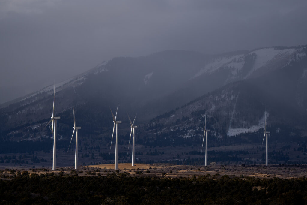 Wind turbines generate electricity at an energy development at the foot of the Abajo Mountains near Monticello on Wednesday, Jan. 29, 2025. (Photo by Spenser Heaps for Utah News Dispatch)