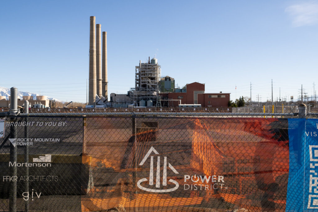 Rocky Mountain Power’s Gadsby Plant backdrops signage promoting the coming redevelopment of parcels around the plant in the Fairpark neighborhood of Salt Lake City on Wednesday, April 3, 2024. (Photo by Spenser Heaps for Utah News Dispatch)