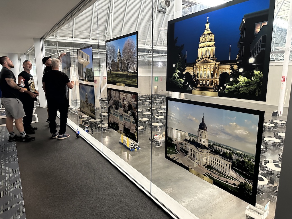 Crews install portraits of state capitol buildings at the Thomas Michael Menino Convention and Exhibition Center on Aug. 4 in Boston. Many lawmakers attending the National Conference of State Legislatures annual summit said they were still grappling with how to respond to President Donald Trump’s major tax and spending law. (Photo by Kevin Hardy/Stateline)