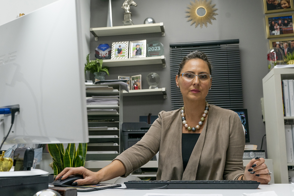 Dorota Mani sits at her desk in her Jersey City, N.J., office in November 2023. Mani’s teenage daughter was victimized by an AI-generated deepfake image last year. (Peter K. Afriyie/The Associated Press)