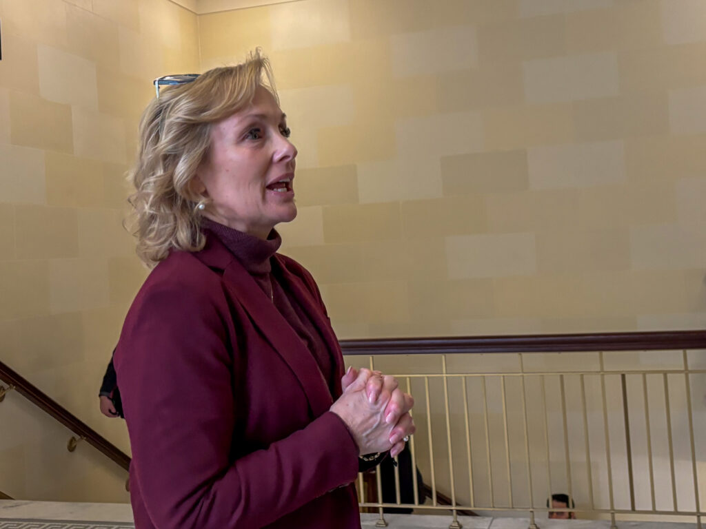 Utah Auditor Tina Cannon speaks to reporters at the Utah State Capitol in Salt Lake City on Friday, March 7, 2025. (Kyle Dunphey/Utah News Dispatch)