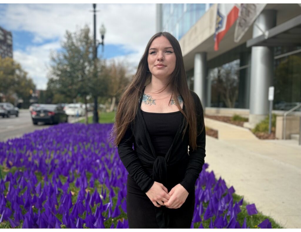 Alivia poses for a portrait outside the Salt Lake County District Attorney’s Office, where a display of purple flags honors survivors of domestic violence, on Thursday, Oct. 16, 2025. (Annie Knox, Utah News Dispatch)