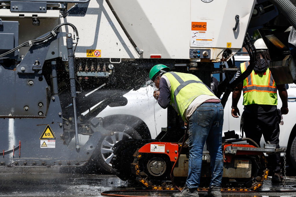 A construction worker sprays water on his face during a break in maintenance work along Pennsylvania Avenue in Washington, D.C. States and the District of Columbia that expanded Medicaid must begin verifying millions of enrollees’ monthly work status by the end of next year — a task some critics say states will have a hard time carrying out. (Photo by Anna Moneymaker/Getty Images)