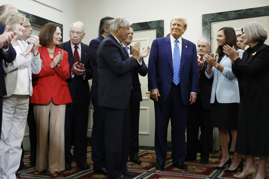 Former President Donald Trump is applauded by U.S. Senate Republicans before giving remarks to the press at the National Republican Senatorial Committee headquarters on June 13, 2024. Trump, the presumptive GOP presidential nominee, visited Capitol Hill to meet with House and Senate Republicans. (Photo by Anna Moneymaker/Getty Images)