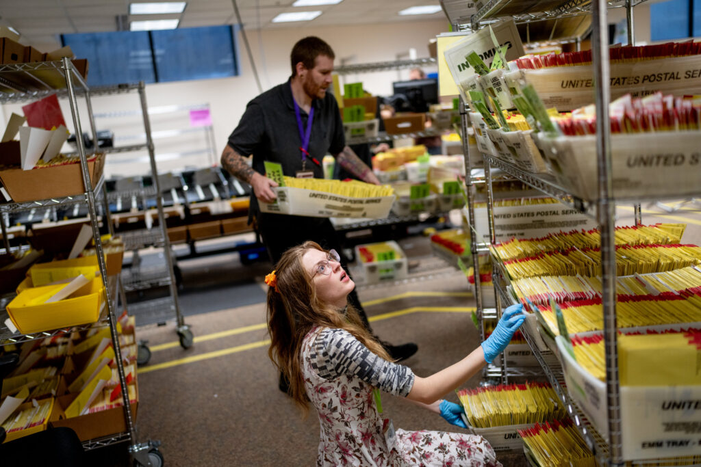 Eva Przybyla, front, and Nicholas Wells process ballots at the Salt Lake County Government Center in Salt Lake City on Election Day, Tuesday, Nov. 5, 2024. (Photo by Spenser Heaps for Utah News Dispatch)
